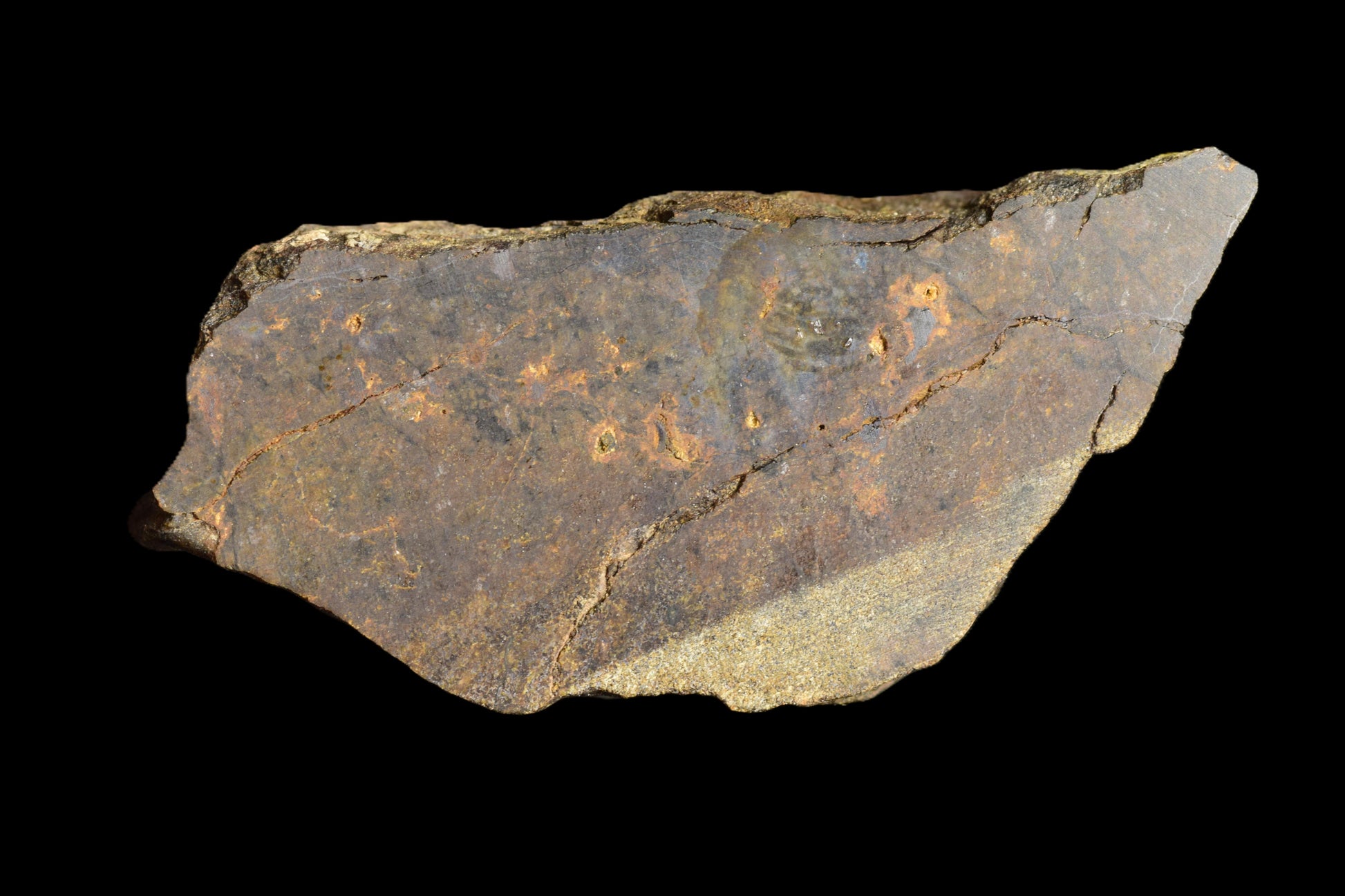 Discovered in Mauritania and purchased in December 2019, NWA 13272 is a rare ungrouped achondrite with igneous textures unlike any established meteorite group. Polished surfaces reveal a fine-grained poikilitic structure with twinned pyroxenes, olivine, devitrified silicic glass, and traces of metal—making it both scientifically significant and visually striking.